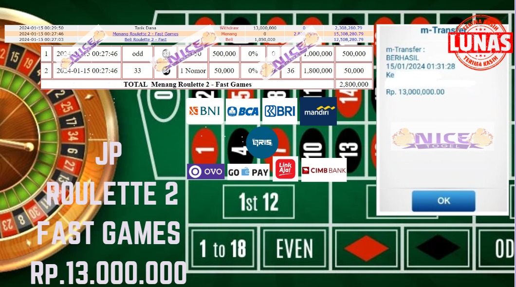 Selamat kepada User id : Lop** Telah berhasil mendapatkan kemenangan besar pada permainan ROULETTE 2 Dengan kemenangan Sebesar Rp.13.000.000,- Setelah mengisi formulir withdraw dengan kurung waktu hanya 5 – 10 menit pihak NICETOGEL sudah melakukan transfer kepada pemilik Userid dan dana sudah dapat di cairkan oleh pemenang. Bukti pembayaran yang kami berikan merupakan bukti pembayaran yang SAH / VALID yang langung di dapatkan melaui tanda transfer transaksi dari Bank yang di tuju.
