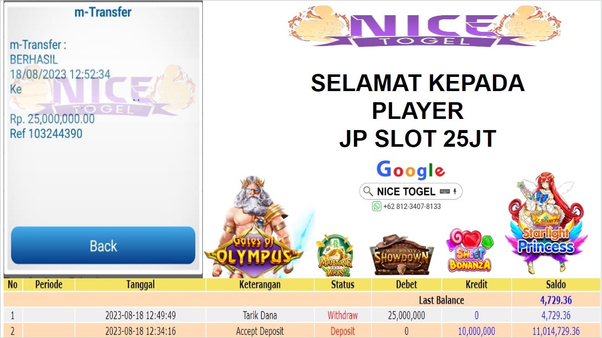 Selamat kepada User id : Top** Telah berhasil mendapatkan kemenangan besar pada permainan SLOT GATES OF OLYMPUS  Dengan kemenangan Sebesar Rp.25.000.000,- Setelah mengisi formulir withdraw dengan kurung waktu hanya 5 – 10 menit pihak NICETOGEL sudah melakukan transfer kepada pemilik Userid dan dana sudah dapat di cairkan oleh pemenang. Bukti pembayaran yang kami berikan merupakan bukti pembayaran yang SAH / VALID yang langung di dapatkan melaui tanda transfer transaksi dari Bank yang di tuju.