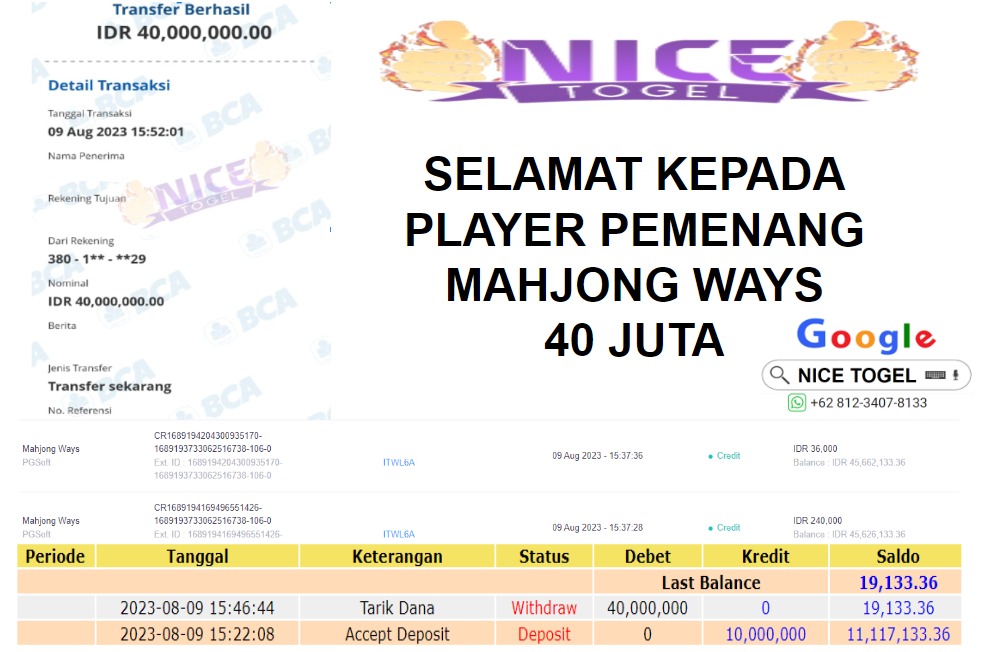 Selamat kepada User id : Pol** Telah berhasil mendapatkan kemenangan besar pada permainan SLOT MAHYONG WAYS2 Dengan kemenangan Sebesar Rp.40.000.000,- Setelah mengisi formulir withdraw dengan kurung waktu hanya 5 – 10 menit pihak NICETOGEL sudah melakukan transfer kepada pemilik Userid dan dana sudah dapat di cairkan oleh pemenang. Bukti pembayaran yang kami berikan merupakan bukti pembayaran yang SAH / VALID yang langung di dapatkan melaui tanda transfer transaksi dari Bank yang di tuju.