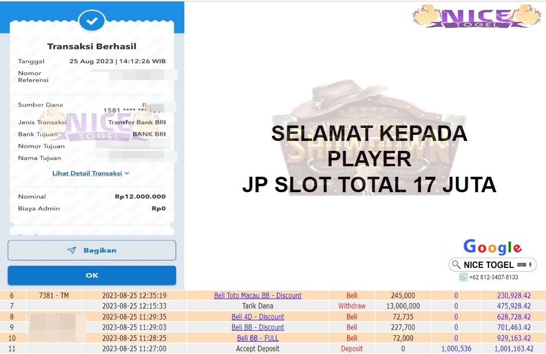 Selamat kepada User id : Olp** Telah berhasil mendapatkan kemenangan besar pada permainan SLOT SHOWDOWN Dengan kemenangan Sebesar Rp.17.000.000,- Setelah mengisi formulir withdraw dengan kurung waktu hanya 5 – 10 menit pihak NICETOGEL sudah melakukan transfer kepada pemilik Userid dan dana sudah dapat di cairkan oleh pemenang. Bukti pembayaran yang kami berikan merupakan bukti pembayaran yang SAH / VALID yang langung di dapatkan melaui tanda transfer transaksi dari Bank yang di tuju.