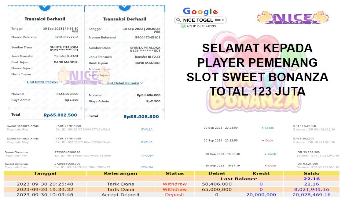 Selamat kepada User id : Ant** Telah berhasil mendapatkan kemenangan besar pada permainan SLOT SWEET BONANZA Dengan kemenangan Sebesar Rp.123.000.000,- Setelah mengisi formulir withdraw dengan kurung waktu hanya 5 – 10 menit pihak NICETOGEL sudah melakukan transfer kepada pemilik Userid dan dana sudah dapat di cairkan oleh pemenang. Bukti pembayaran yang kami berikan merupakan bukti pembayaran yang SAH / VALID yang langung di dapatkan melaui tanda transfer transaksi dari Bank yang di tuju.