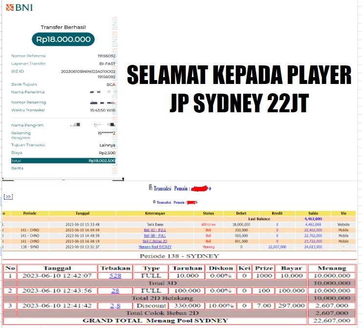 Selamat kepada User id : a**** Telah berhasil mendapatkan kemenangan besar pada permainan SYDNEY Dengan kemenangan Sebesar Rp 22.000.000,- Setelah mengisi formulir withdraw dengan kurung waktu hanya 5 – 10 menit pihak NICETOGEL sudah melakukan transfer kepada pemilik Userid dan dana sudah dapat di cairkan oleh pemenang. Bukti pembayaran yang kami berikan merupakan bukti pembayaran yang SAH / VALID yang langung di dapatkan melaui tanda transfer transaksi dari Bank yang di tuju.