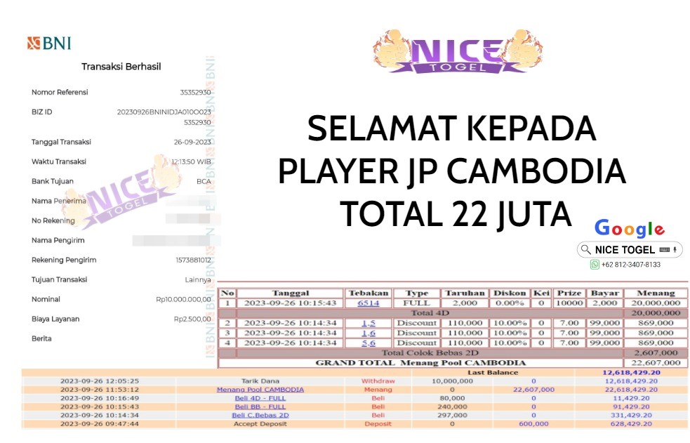 Selamat kepada User id : Ouy** Telah berhasil mendapatkan kemenangan besar pada permainan TOGEL CAMBODIA Dengan kemenangan Sebesar Rp.22.000.000,- Setelah mengisi formulir withdraw dengan kurung waktu hanya 5 – 10 menit pihak NICETOGEL sudah melakukan transfer kepada pemilik Userid dan dana sudah dapat di cairkan oleh pemenang. Bukti pembayaran yang kami berikan merupakan bukti pembayaran yang SAH / VALID yang langung di dapatkan melaui tanda transfer transaksi dari Bank yang di tuju.