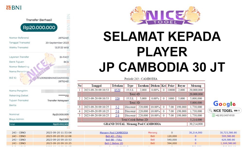 Selamat kepada User id : Haj** Telah berhasil mendapatkan kemenangan besar pada permainan TOGEL CAMBODIA Dengan kemenangan Sebesar Rp.30.000.000,- Setelah mengisi formulir withdraw dengan kurung waktu hanya 5 – 10 menit pihak NICETOGEL sudah melakukan transfer kepada pemilik Userid dan dana sudah dapat di cairkan oleh pemenang. Bukti pembayaran yang kami berikan merupakan bukti pembayaran yang SAH / VALID yang langung di dapatkan melaui tanda transfer transaksi dari Bank yang di tuju.