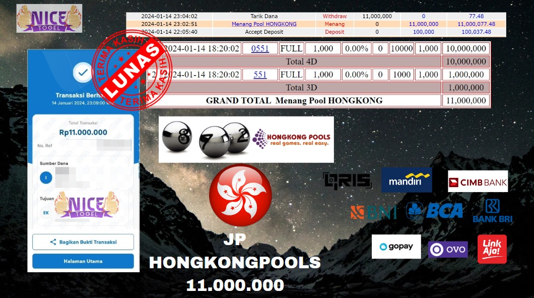 Selamat kepada User id : Tre** Telah berhasil mendapatkan kemenangan besar pada permainan TOGEL HONGKONG Dengan kemenangan Sebesar Rp.11.000.000,- Setelah mengisi formulir withdraw dengan kurung waktu hanya 5 – 10 menit pihak NICETOGEL sudah melakukan transfer kepada pemilik Userid dan dana sudah dapat di cairkan oleh pemenang. Bukti pembayaran yang kami berikan merupakan bukti pembayaran yang SAH / VALID yang langung di dapatkan melaui tanda transfer transaksi dari Bank yang di tuju.