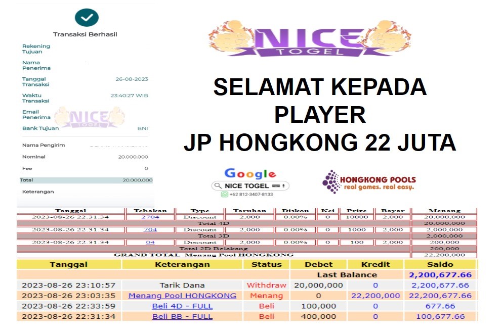 Selamat kepada User id : Koi** Telah berhasil mendapatkan kemenangan besar pada permainan TOGEL HONGKONG Dengan kemenangan Sebesar Rp.22.000.000,- Setelah mengisi formulir withdraw dengan kurung waktu hanya 5 – 10 menit pihak NICETOGEL sudah melakukan transfer kepada pemilik Userid dan dana sudah dapat di cairkan oleh pemenang. Bukti pembayaran yang kami berikan merupakan bukti pembayaran yang SAH / VALID yang langung di dapatkan melaui tanda transfer transaksi dari Bank yang di tuju.