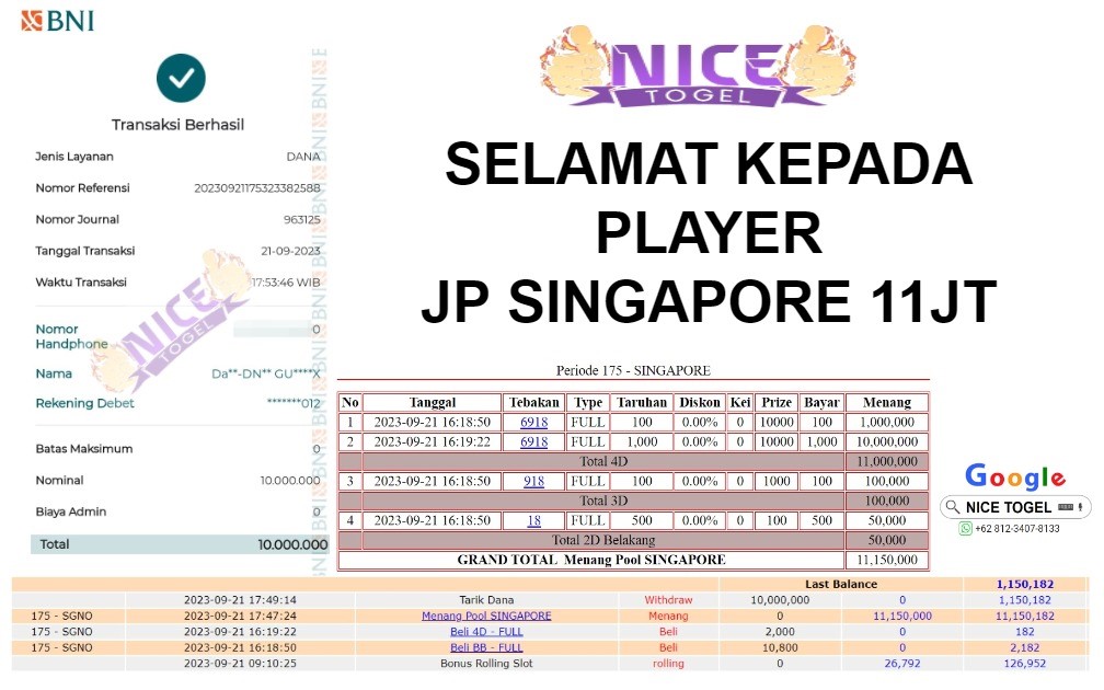 Selamat kepada User id : Adf** Telah berhasil mendapatkan kemenangan besar pada permainan TOGEL SINGAPORE Dengan kemenangan Sebesar Rp.11.000.000,- Setelah mengisi formulir withdraw dengan kurung waktu hanya 5 – 10 menit pihak NICETOGEL sudah melakukan transfer kepada pemilik Userid dan dana sudah dapat di cairkan oleh pemenang. Bukti pembayaran yang kami berikan merupakan bukti pembayaran yang SAH / VALID yang langung di dapatkan melaui tanda transfer transaksi dari Bank yang di tuju.