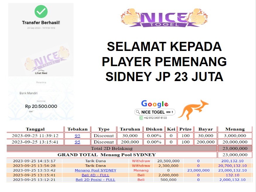 Selamat kepada User id : Urt** Telah berhasil mendapatkan kemenangan besar pada permainan TOGEL SYDNEY Dengan kemenangan Sebesar Rp.23.000.000,- Setelah mengisi formulir withdraw dengan kurung waktu hanya 5 – 10 menit pihak NICETOGEL sudah melakukan transfer kepada pemilik Userid dan dana sudah dapat di cairkan oleh pemenang. Bukti pembayaran yang kami berikan merupakan bukti pembayaran yang SAH / VALID yang langung di dapatkan melaui tanda transfer transaksi dari Bank yang di tuju.