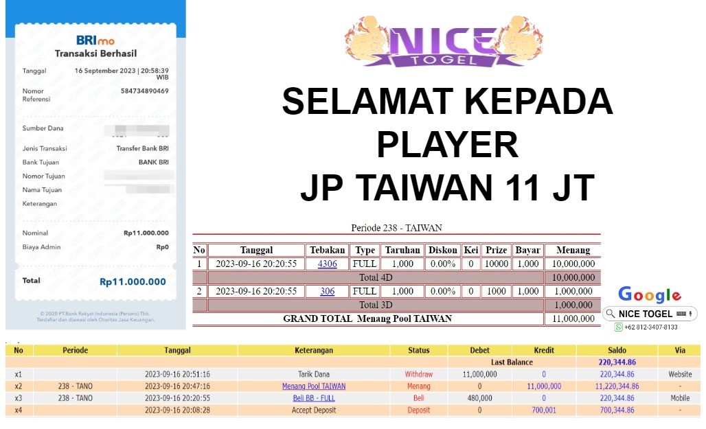 Selamat kepada User id : Pol** Telah berhasil mendapatkan kemenangan besar pada permainan TOGEL TAIWAN Dengan kemenangan Sebesar Rp.11.000.000,- Setelah mengisi formulir withdraw dengan kurung waktu hanya 5 – 10 menit pihak NICETOGEL sudah melakukan transfer kepada pemilik Userid dan dana sudah dapat di cairkan oleh pemenang. Bukti pembayaran yang kami berikan merupakan bukti pembayaran yang SAH / VALID yang langung di dapatkan melaui tanda transfer transaksi dari Bank yang di tuju.