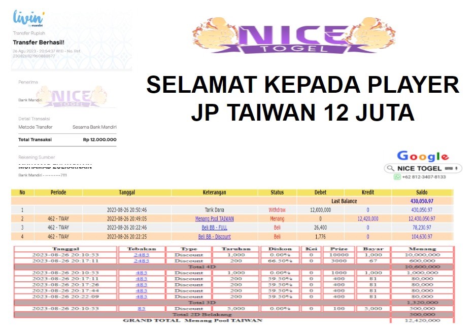 Selamat kepada User id : Luc** Telah berhasil mendapatkan kemenangan besar pada permainan TOGEL TAIWAN Dengan kemenangan Sebesar Rp.12.000.000,- Setelah mengisi formulir withdraw dengan kurung waktu hanya 5 – 10 menit pihak NICETOGEL sudah melakukan transfer kepada pemilik Userid dan dana sudah dapat di cairkan oleh pemenang. Bukti pembayaran yang kami berikan merupakan bukti pembayaran yang SAH / VALID yang langung di dapatkan melaui tanda transfer transaksi dari Bank yang di tuju.