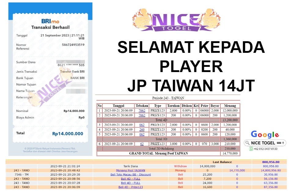 Selamat kepada User id : Iou** Telah berhasil mendapatkan kemenangan besar pada permainan TOGEL TAIWAN Dengan kemenangan Sebesar Rp.14.000.000,- Setelah mengisi formulir withdraw dengan kurung waktu hanya 5 – 10 menit pihak NICETOGEL sudah melakukan transfer kepada pemilik Userid dan dana sudah dapat di cairkan oleh pemenang. Bukti pembayaran yang kami berikan merupakan bukti pembayaran yang SAH / VALID yang langung di dapatkan melaui tanda transfer transaksi dari Bank yang di tuju.