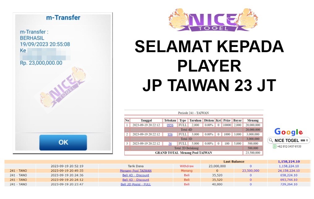 Selamat kepada User id : Dem** Telah berhasil mendapatkan kemenangan besar pada permainan TOGEL TAIWAN Dengan kemenangan Sebesar Rp.23.000.000,- Setelah mengisi formulir withdraw dengan kurung waktu hanya 5 – 10 menit pihak NICETOGEL sudah melakukan transfer kepada pemilik Userid dan dana sudah dapat di cairkan oleh pemenang. Bukti pembayaran yang kami berikan merupakan bukti pembayaran yang SAH / VALID yang langung di dapatkan melaui tanda transfer transaksi dari Bank yang di tuju.