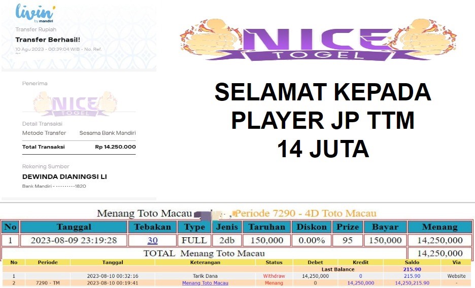 Selamat kepada User id : Pir** Telah berhasil mendapatkan kemenangan besar pada permainan TOTOMACAU Dengan kemenangan Sebesar Rp.14.000.000,- Setelah mengisi formulir withdraw dengan kurung waktu hanya 5 – 10 menit pihak NICETOGEL sudah melakukan transfer kepada pemilik Userid dan dana sudah dapat di cairkan oleh pemenang. Bukti pembayaran yang kami berikan merupakan bukti pembayaran yang SAH / VALID yang langung di dapatkan melaui tanda transfer transaksi dari Bank yang di tuju.