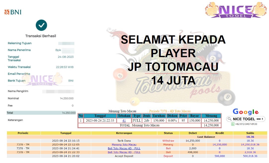 Selamat kepada User id : Knz*** Telah berhasil mendapatkan kemenangan besar pada permainan TOTO MACAU Dengan kemenangan Sebesar Rp.14.000.000,- Setelah mengisi formulir withdraw dengan kurung waktu hanya 5 – 10 menit pihak NICETOGEL sudah melakukan transfer kepada pemilik Userid dan dana sudah dapat di cairkan oleh pemenang. Bukti pembayaran yang kami berikan merupakan bukti pembayaran yang SAH / VALID yang langung di dapatkan melaui tanda transfer transaksi dari Bank yang di tuju.