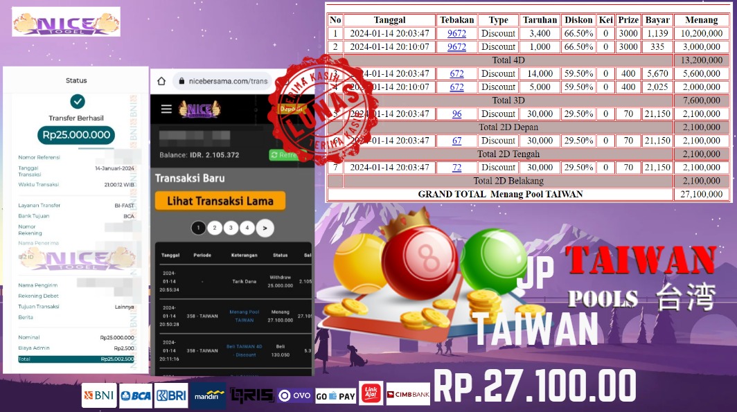 Selamat kepada User id : Ald**** Telah berhasil mendapatkan kemenangan besar pada permainan TAIWAN Dengan kemenangan Sebesar Rp 27.100.000,- Setelah mengisi formulir withdraw dengan kurung waktu hanya 5 – 10 menit pihak NICETOGEL sudah melakukan transfer kepada pemilik Userid dan dana sudah dapat di cairkan oleh pemenang. Bukti pembayaran yang kami berikan merupakan bukti pembayaran yang SAH / VALID yang langung di dapatkan melaui tanda transfer transaksi dari Bank yang di tuju.