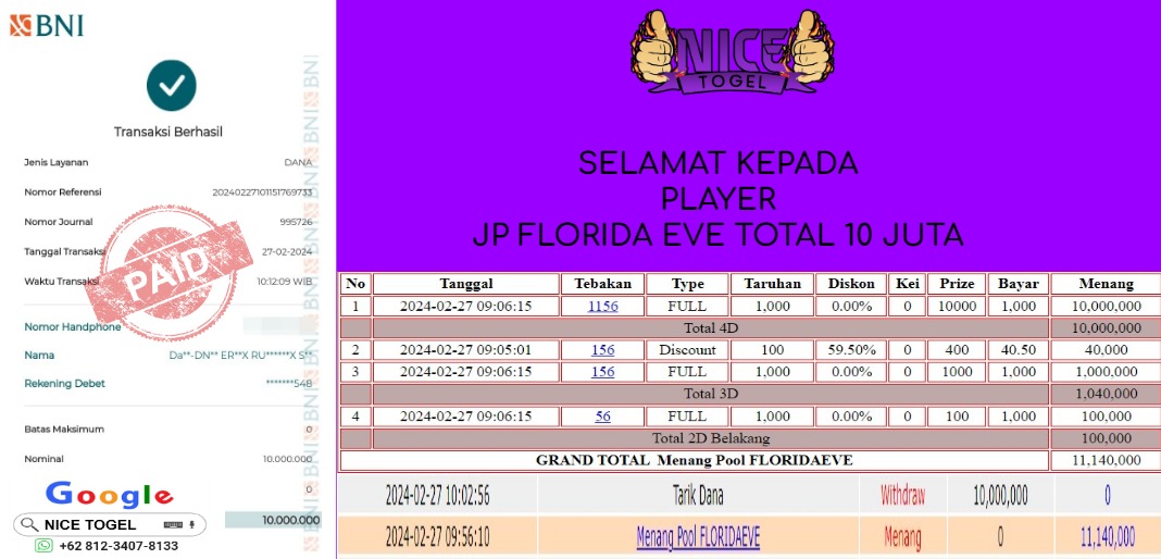 Selamat kepada User id : Ruc** Telah berhasil mendapatkan kemenangan besar pada permainan TOGEL FLORIDAEVE Dengan kemenangan Sebesar Rp.10.000.000,- Setelah mengisi formulir withdraw dengan kurung waktu hanya 5 – 10 menit pihak NICETOGEL sudah melakukan transfer kepada pemilik Userid dan dana sudah dapat di cairkan oleh pemenang. Bukti pembayaran yang kami berikan merupakan bukti pembayaran yang SAH / VALID yang langung di dapatkan melaui tanda transfer transaksi dari Bank yang di tuju.