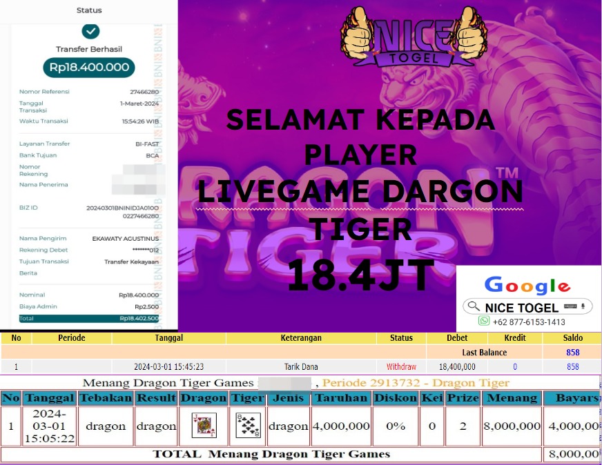 Selamat kepada User id : s*** Telah berhasil mendapatkan kemenangan besar pada permainan LIVE DRAGON TIGER Dengan kemenangan Sebesar Rp.18.400.000,- Setelah mengisi formulir withdraw dengan kurung waktu hanya 5 – 10 menit pihak NICETOGEL sudah melakukan transfer kepada pemilik Userid dan dana sudah dapat di cairkan oleh pemenang. Bukti pembayaran yang kami berikan merupakan bukti pembayaran yang SAH / VALID yang langung di dapatkan melaui tanda transfer transaksi dari Bank yang di tuju.