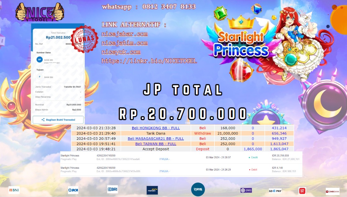 Selamat kepada User id : Luc** Telah berhasil mendapatkan kemenangan besar pada permainan SLOT STARLIGHT PRINCES Dengan kemenangan Sebesar Rp.20.700.000,- Setelah mengisi formulir withdraw dengan kurung waktu hanya 5 – 10 menit pihak NICETOGEL sudah melakukan transfer kepada pemilik Userid dan dana sudah dapat di cairkan oleh pemenang. Bukti pembayaran yang kami berikan merupakan bukti pembayaran yang SAH / VALID yang langung di dapatkan melaui tanda transfer transaksi dari Bank yang di tuju.