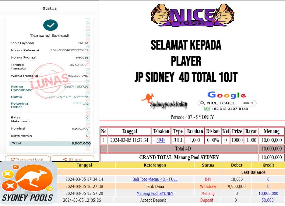 Selamat kepada User id : Kol** Telah berhasil mendapatkan kemenangan besar pada permainan TOGEL SYDNEY Dengan kemenangan Sebesar Rp.10.000.000,- Setelah mengisi formulir withdraw dengan kurung waktu hanya 5 – 10 menit pihak NICETOGEL sudah melakukan transfer kepada pemilik Userid dan dana sudah dapat di cairkan oleh pemenang. Bukti pembayaran yang kami berikan merupakan bukti pembayaran yang SAH / VALID yang langung di dapatkan melaui tanda transfer transaksi dari Bank yang di tuju.