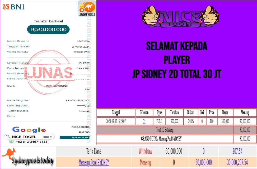 Selamat kepada User id : Apo** Telah berhasil mendapatkan kemenangan besar pada permainan TOGEL SYDNEY Dengan kemenangan Sebesar Rp.30.000.000,- Setelah mengisi formulir withdraw dengan kurung waktu hanya 5 – 10 menit pihak NICETOGEL sudah melakukan transfer kepada pemilik Userid dan dana sudah dapat di cairkan oleh pemenang. Bukti pembayaran yang kami berikan merupakan bukti pembayaran yang SAH / VALID yang langung di dapatkan melaui tanda transfer transaksi dari Bank yang di tuju.