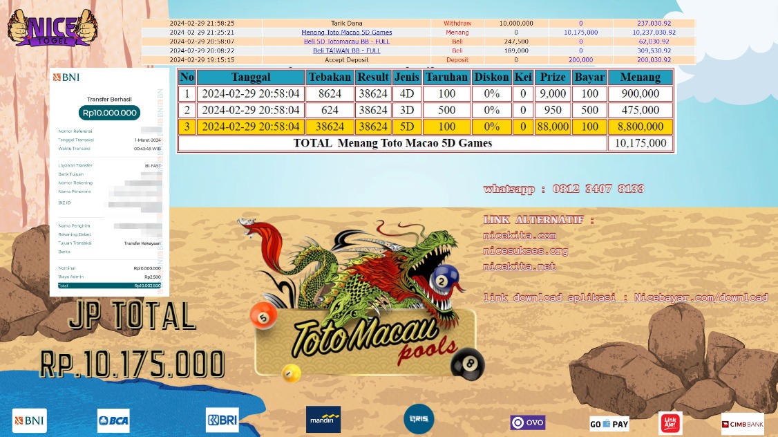 Selamat kepada User id : ak**** Telah berhasil mendapatkan kemenangan besar pada permainan TOGEL TOTO MACAU Dengan kemenangan Sebesar Rp.10.175.000,- Setelah mengisi formulir withdraw dengan kurung waktu hanya 5 – 10 menit pihak NICETOGEL sudah melakukan transfer kepada pemilik Userid dan dana sudah dapat di cairkan oleh pemenang. Bukti pembayaran yang kami berikan merupakan bukti pembayaran yang SAH / VALID yang langung di dapatkan melaui tanda transfer transaksi dari Bank yang di tuju.