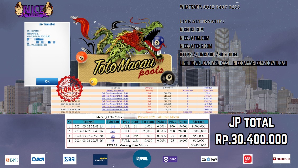 Selamat kepada User id : a** Telah berhasil mendapatkan kemenangan besar pada permainan TOGEL TOTO MACAU Dengan kemenangan Sebesar Rp.30.400.000,- Setelah mengisi formulir withdraw dengan kurung waktu hanya 5 – 10 menit pihak NICETOGEL sudah melakukan transfer kepada pemilik Userid dan dana sudah dapat di cairkan oleh pemenang. Bukti pembayaran yang kami berikan merupakan bukti pembayaran yang SAH / VALID yang langung di dapatkan melaui tanda transfer transaksi dari Bank yang di tuju.