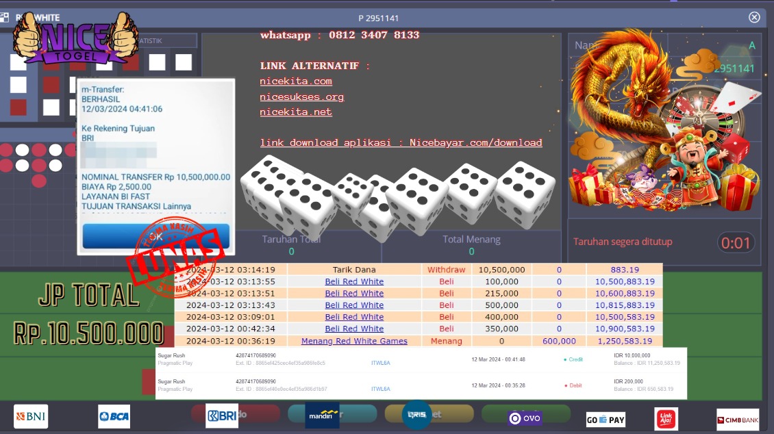 Selamat kepada User id : l** Telah berhasil mendapatkan kemenangan besar pada permainan RED WHITE GAMES Dengan kemenangan Sebesar Rp.10.500.000,- Setelah mengisi formulir withdraw dengan kurung waktu hanya 5 – 10 menit pihak NICETOGEL sudah melakukan transfer kepada pemilik Userid dan dana sudah dapat di cairkan oleh pemenang. Bukti pembayaran yang kami berikan merupakan bukti pembayaran yang SAH / VALID yang langung di dapatkan melaui tanda transfer transaksi dari Bank yang di tuju.