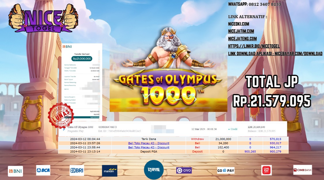 Selamat kepada User id : t** Telah berhasil mendapatkan kemenangan besar pada permainan SLOT GATES OF OLYMPUS Dengan kemenangan Sebesar Rp.21.579.000,- Setelah mengisi formulir withdraw dengan kurung waktu hanya 5 – 10 menit pihak NICETOGEL sudah melakukan transfer kepada pemilik Userid dan dana sudah dapat di cairkan oleh pemenang. Bukti pembayaran yang kami berikan merupakan bukti pembayaran yang SAH / VALID yang langung di dapatkan melaui tanda transfer transaksi dari Bank yang di tuju.