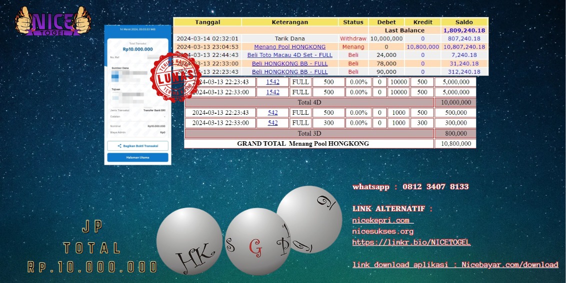 Selamat kepada User id : Lic** Telah berhasil mendapatkan kemenangan besar pada permainan TOGEL HONGKONG Dengan kemenangan Sebesar Rp.10.000.000,- Setelah mengisi formulir withdraw dengan kurung waktu hanya 5 – 10 menit pihak NICETOGEL sudah melakukan transfer kepada pemilik Userid dan dana sudah dapat di cairkan oleh pemenang. Bukti pembayaran yang kami berikan merupakan bukti pembayaran yang SAH / VALID yang langung di dapatkan melaui tanda transfer transaksi dari Bank yang di tuju.