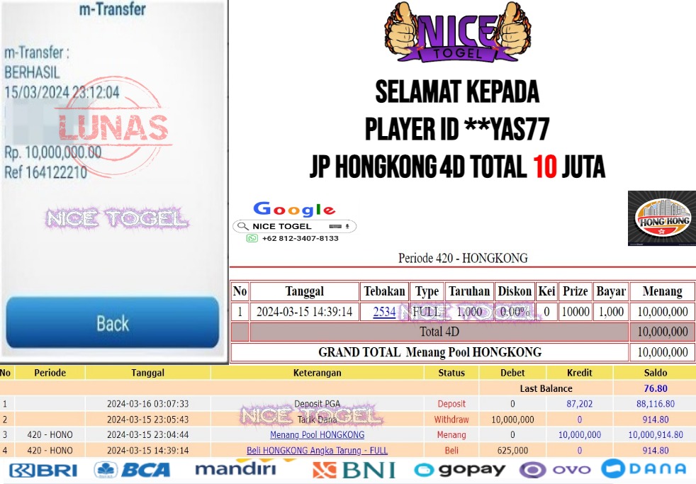 Selamat kepada User id : AIc** Telah berhasil mendapatkan kemenangan besar pada permainanTOGEL HONGKONG Dengan kemenangan Sebesar Rp.10.000.000,- Setelah mengisi formulir withdraw dengan kurung waktu hanya 5 – 10 menit pihak NICETOGEL sudah melakukan transfer kepada pemilik Userid dan dana sudah dapat di cairkan oleh pemenang. Bukti pembayaran yang kami berikan merupakan bukti pembayaran yang SAH / VALID yang langung di dapatkan melaui tanda transfer transaksi dari Bank yang di tuju.