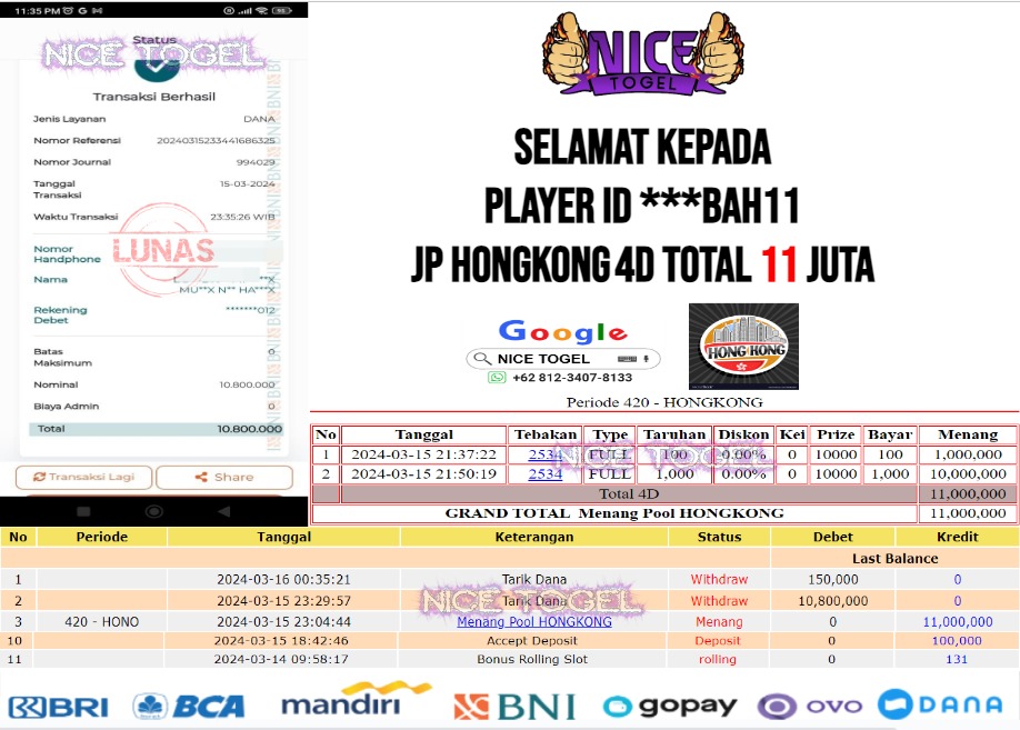 Selamat kepada User id : Muc** Telah berhasil mendapatkan kemenangan besar pada permainan TOGEL HONGKONG Dengan kemenangan Sebesar Rp.11.000.000,- Setelah mengisi formulir withdraw dengan kurung waktu hanya 5 – 10 menit pihak NICETOGEL sudah melakukan transfer kepada pemilik Userid dan dana sudah dapat di cairkan oleh pemenang. Bukti pembayaran yang kami berikan merupakan bukti pembayaran yang SAH / VALID yang langung di dapatkan melaui tanda transfer transaksi dari Bank yang di tuju.