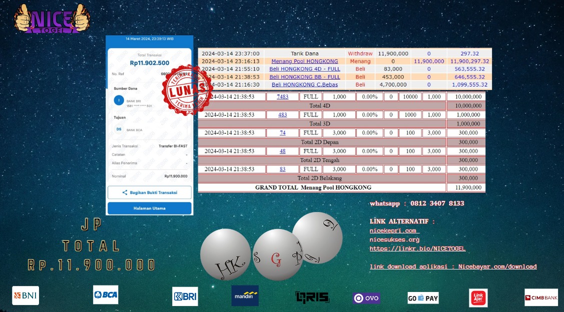 Selamat kepada User id : Beh** Telah berhasil mendapatkan kemenangan besar pada permainan TOGEL HONGKONG Dengan kemenangan Sebesar Rp.11.900.000,- Setelah mengisi formulir withdraw dengan kurung waktu hanya 5 – 10 menit pihak NICETOGEL sudah melakukan transfer kepada pemilik Userid dan dana sudah dapat di cairkan oleh pemenang. Bukti pembayaran yang kami berikan merupakan bukti pembayaran yang SAH / VALID yang langung di dapatkan melaui tanda transfer transaksi dari Bank yang di tuju.