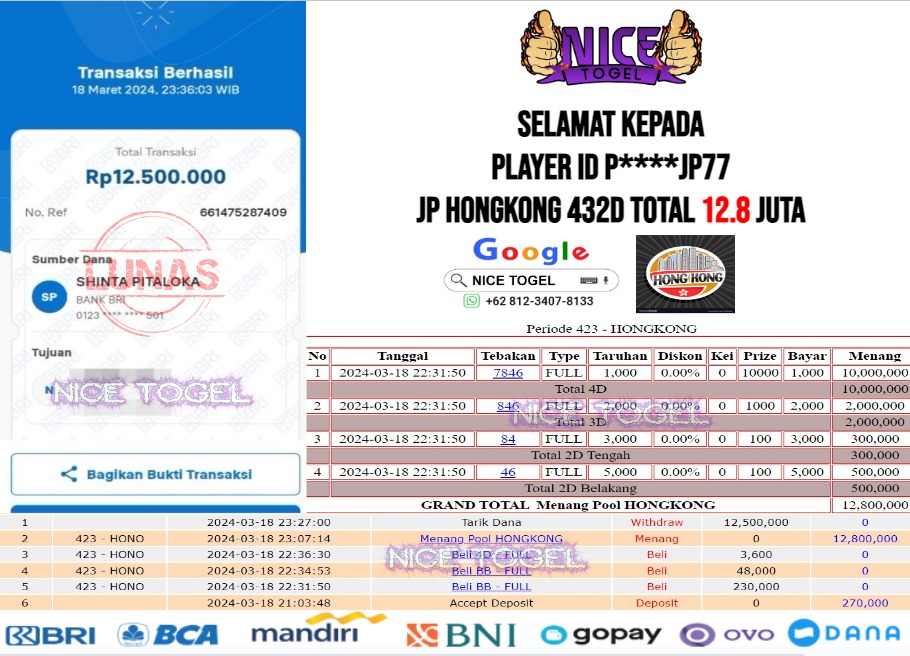 Selamat kepada User id : b** Telah berhasil mendapatkan kemenangan besar pada permainan TOGEL HONGKONG 432D Dengan kemenangan Sebesar Rp.12.800.000,- Setelah mengisi formulir withdraw dengan kurung waktu hanya 5 – 10 menit pihak NICETOGEL sudah melakukan transfer kepada pemilik Userid dan dana sudah dapat di cairkan oleh pemenang. Bukti pembayaran yang kami berikan merupakan bukti pembayaran yang SAH / VALID yang langung di dapatkan melaui tanda transfer transaksi dari Bank yang di tuju.