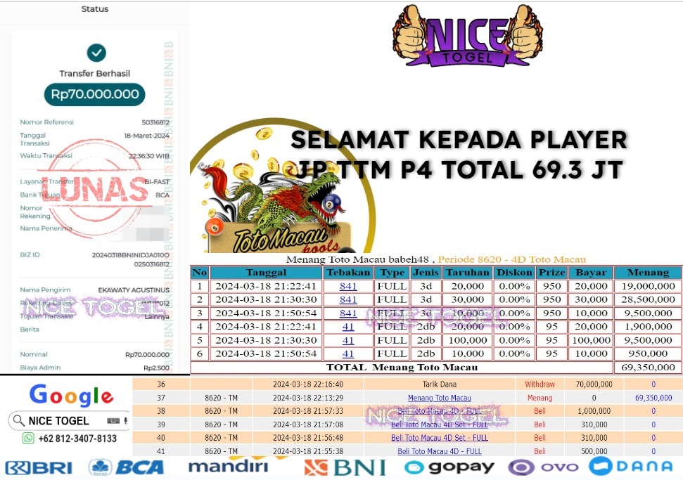 Selamat kepada User id : n** Telah berhasil mendapatkan kemenangan besar pada permainan TOGEL TOTO MACAU P4 Dengan kemenangan Sebesar Rp.69.300.000,- Setelah mengisi formulir withdraw dengan kurung waktu hanya 5 – 10 menit pihak NICETOGEL sudah melakukan transfer kepada pemilik Userid dan dana sudah dapat di cairkan oleh pemenang. Bukti pembayaran yang kami berikan merupakan bukti pembayaran yang SAH / VALID yang langung di dapatkan melaui tanda transfer transaksi dari Bank yang di tuju.