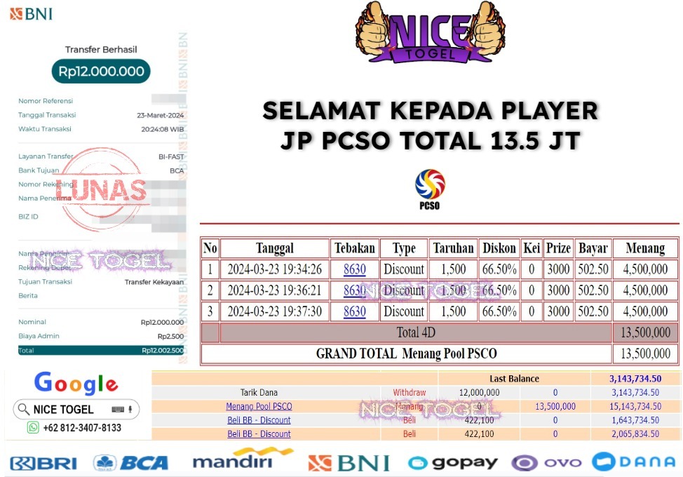 Selamat kepada User id : i** Telah berhasil mendapatkan kemenangan besar pada permainan TOGEL PCSO Dengan kemenangan Sebesar Rp.13.500.000,- Setelah mengisi formulir withdraw dengan kurung waktu hanya 5 – 10 menit pihak NICETOGEL sudah melakukan transfer kepada pemilik Userid dan dana sudah dapat di cairkan oleh pemenang. Bukti pembayaran yang kami berikan merupakan bukti pembayaran yang SAH / VALID yang langung di dapatkan melaui tanda transfer transaksi dari Bank yang di tuju.