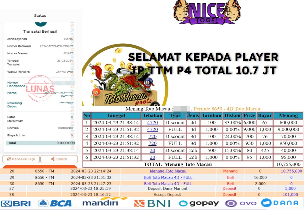 Selamat kepada User id : Ar***** Telah berhasil mendapatkan kemenangan besar pada permainan TOGEL TOTO MACAU P4 Dengan kemenangan Sebesar Rp.10.700.000,- Setelah mengisi formulir withdraw dengan kurung waktu hanya 5 – 10 menit pihak NICETOGEL sudah melakukan transfer kepada pemilik Userid dan dana sudah dapat di cairkan oleh pemenang. Bukti pembayaran yang kami berikan merupakan bukti pembayaran yang SAH / VALID yang langung di dapatkan melaui tanda transfer transaksi dari Bank yang di tuju.