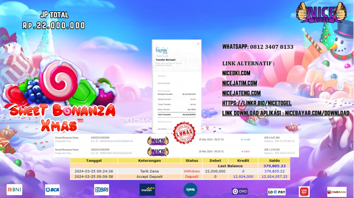 Selamat kepada User id : Haj** Telah berhasil mendapatkan kemenangan besar pada permainan SLOT SWEET BONANZA XMAS Dengan kemenangan Sebesar Rp.22.000.000,- Setelah mengisi formulir withdraw dengan kurung waktu hanya 5 – 10 menit pihak NICETOGEL sudah melakukan transfer kepada pemilik Userid dan dana sudah dapat di cairkan oleh pemenang. Bukti pembayaran yang kami berikan merupakan bukti pembayaran yang SAH / VALID yang langung di dapatkan melaui tanda transfer transaksi dari Bank yang di tuju.
