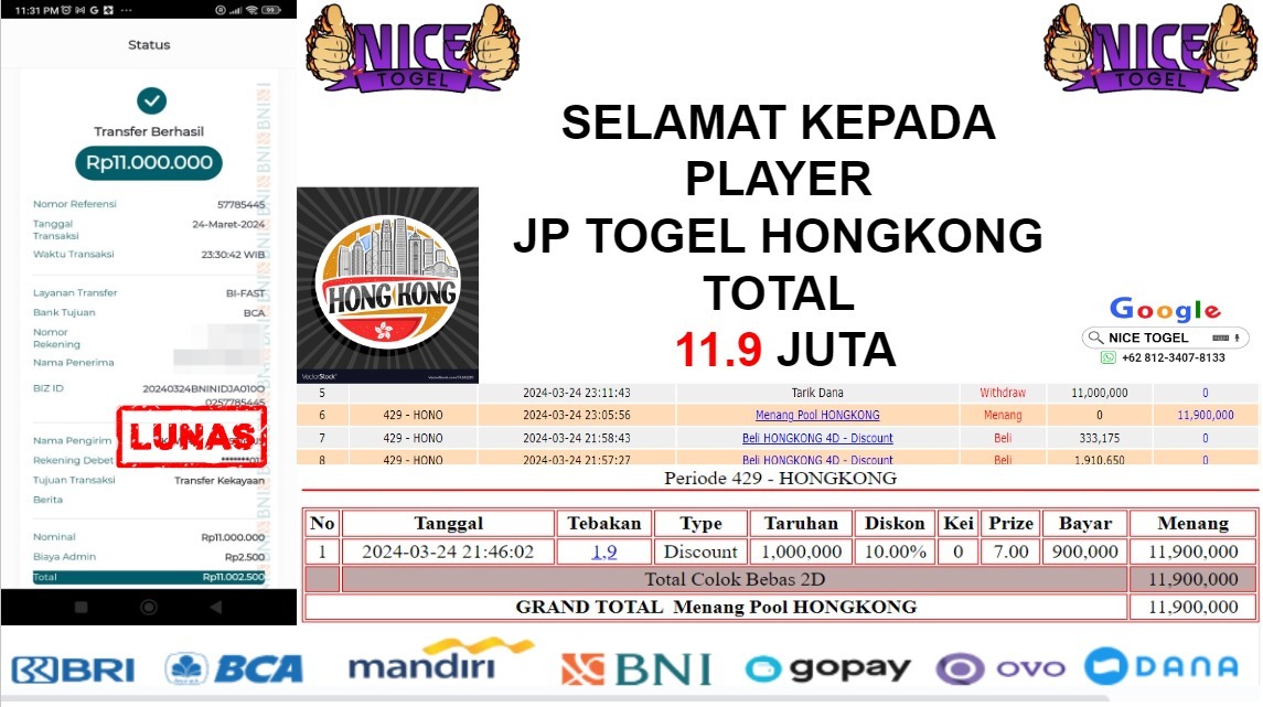 Selamat kepada User id : Das**** Telah berhasil mendapatkan kemenangan besar pada TOGEL HONGKONG Dengan kemenangan Sebesar Rp.11.900.000,- Setelah mengisi formulir withdraw dengan kurung waktu hanya 5 – 10 menit pihak NICETOGEL sudah melakukan transfer kepada pemilik Userid dan dana sudah dapat di cairkan oleh pemenang. Bukti pembayaran yang kami berikan merupakan bukti pembayaran yang SAH / VALID yang langung di dapatkan melaui tanda transfer transaksi dari Bank yang di tuju.