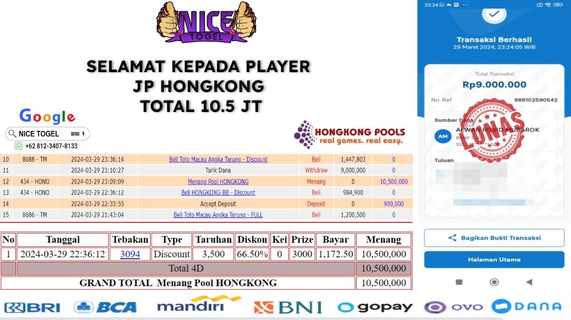 Selamat kepada User id : D**** Telah berhasil mendapatkan kemenangan besar pada TOGEL HONGKONG Dengan kemenangan Sebesar Rp.10.500.000,- Setelah mengisi formulir withdraw dengan kurung waktu hanya 5 – 10 menit pihak NICETOGEL sudah melakukan transfer kepada pemilik Userid dan dana sudah dapat di cairkan oleh pemenang. Bukti pembayaran yang kami berikan merupakan bukti pembayaran yang SAH / VALID yang langung di dapatkan melaui tanda transfer transaksi dari Bank yang di tuju.