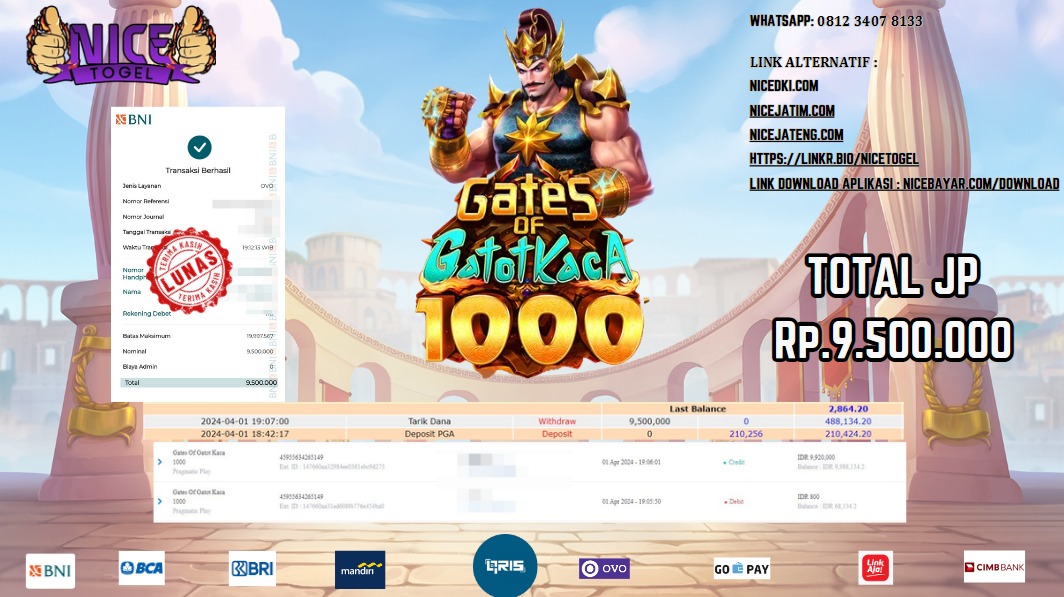 Selamat kepada User id : Ant** Telah berhasil mendapatkan kemenangan besar pada permainan SLOT GATES OF GATOT KACA 1000 Dengan kemenangan Sebesar Rp.9.500.000,- Setelah mengisi formulir withdraw dengan kurung waktu hanya 5 – 10 menit pihak NICETOGEL sudah melakukan transfer kepada pemilik Userid dan dana sudah dapat di cairkan oleh pemenang. Bukti pembayaran yang kami berikan merupakan bukti pembayaran yang SAH / VALID yang langung di dapatkan melaui tanda transfer transaksi dari Bank yang di tuju.