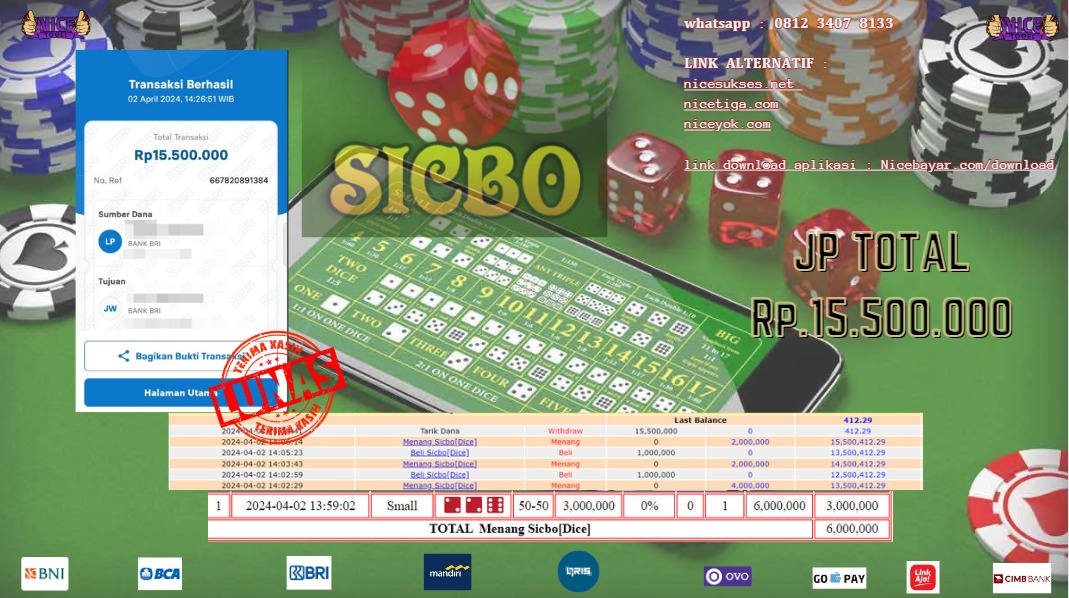 Selamat kepada User id : Kuc** Telah berhasil mendapatkan kemenangan besar pada permainan LIVE GAMES SICBO Dengan kemenangan Sebesar Rp.15.500.000,- Setelah mengisi formulir withdraw dengan kurung waktu hanya 5 – 10 menit pihak NICETOGEL sudah melakukan transfer kepada pemilik Userid dan dana sudah dapat di cairkan oleh pemenang. Bukti pembayaran yang kami berikan merupakan bukti pembayaran yang SAH / VALID yang langung di dapatkan melaui tanda transfer transaksi dari Bank yang di tuju.