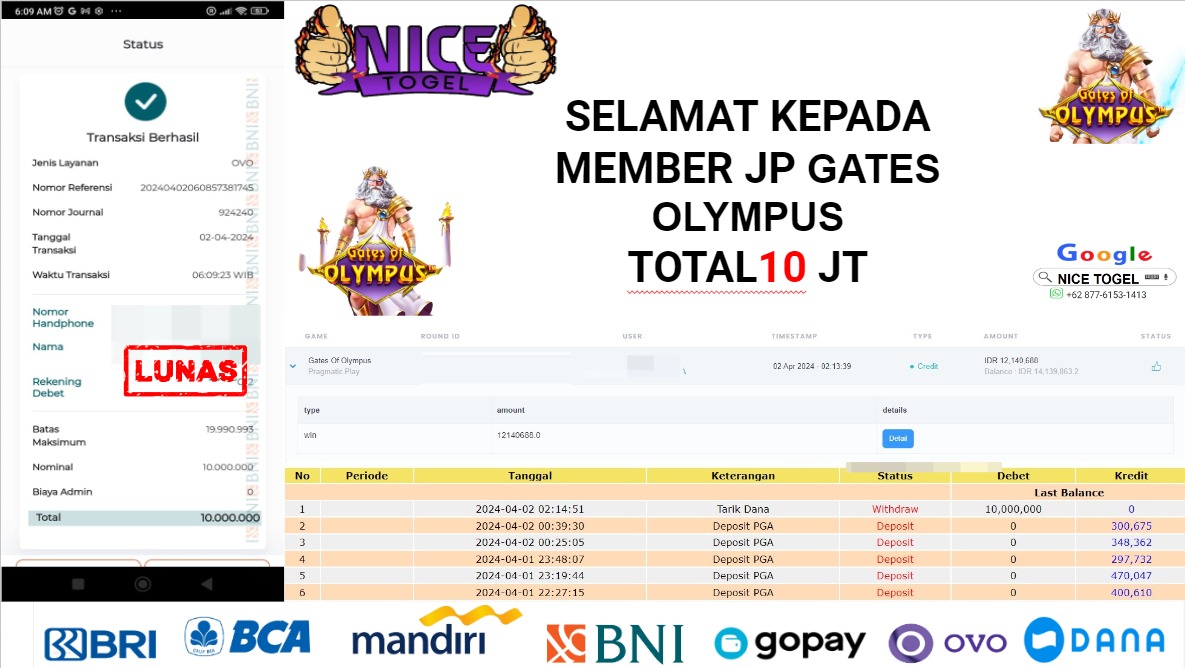Selamat kepada User id : t** Telah berhasil mendapatkan kemenangan besar pada permainan SLOT GATES OF OLYMPUS Dengan kemenangan Sebesar Rp.10.000.000,- Setelah mengisi formulir withdraw dengan kurung waktu hanya 5 – 10 menit pihak NICETOGEL sudah melakukan transfer kepada pemilik Userid dan dana sudah dapat di cairkan oleh pemenang. Bukti pembayaran yang kami berikan merupakan bukti pembayaran yang SAH / VALID yang langung di dapatkan melaui tanda transfer transaksi dari Bank yang di tuju.