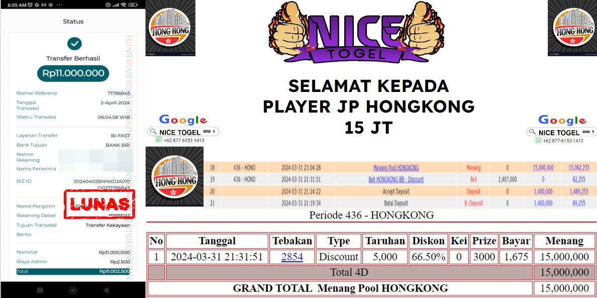 Selamat kepada User id : n** Telah berhasil mendapatkan kemenangan besar pada permainan TOGEL HONGKONG Dengan kemenangan Sebesar Rp.15.000.000,- Setelah mengisi formulir withdraw dengan kurung waktu hanya 5 – 10 menit pihak NICETOGEL sudah melakukan transfer kepada pemilik Userid dan dana sudah dapat di cairkan oleh pemenang. Bukti pembayaran yang kami berikan merupakan bukti pembayaran yang SAH / VALID yang langung di dapatkan melaui tanda transfer transaksi dari Bank yang di tuju.
