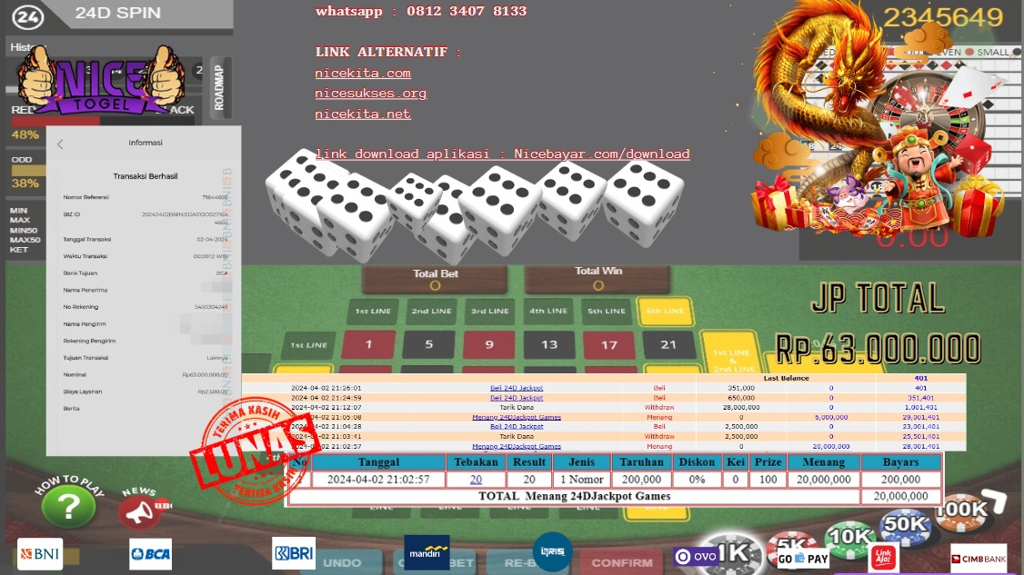 Selamat kepada User id : kris** Telah berhasil mendapatkan kemenangan besar pada permainan LIVEGAMES 24D SPIN Dengan kemenangan Sebesar Rp.63.000.000,- Setelah mengisi formulir withdraw dengan kurung waktu hanya 5 – 10 menit pihak NICETOGEL sudah melakukan transfer kepada pemilik Userid dan dana sudah dapat di cairkan oleh pemenang. Bukti pembayaran yang kami berikan merupakan bukti pembayaran yang SAH / VALID yang langung di dapatkan melaui tanda transfer transaksi dari Bank yang di tuju.