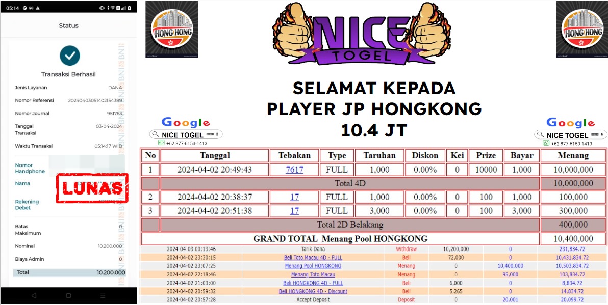 Selamat kepada User id : u** Telah berhasil mendapatkan kemenangan besar pada permainan TOGEL HONGKONG Dengan kemenangan Sebesar Rp.10.400.000,- Setelah mengisi formulir withdraw dengan kurung waktu hanya 5 – 10 menit pihak NICETOGEL sudah melakukan transfer kepada pemilik Userid dan dana sudah dapat di cairkan oleh pemenang. Bukti pembayaran yang kami berikan merupakan bukti pembayaran yang SAH / VALID yang langung di dapatkan melaui tanda transfer transaksi dari Bank yang di tuju.