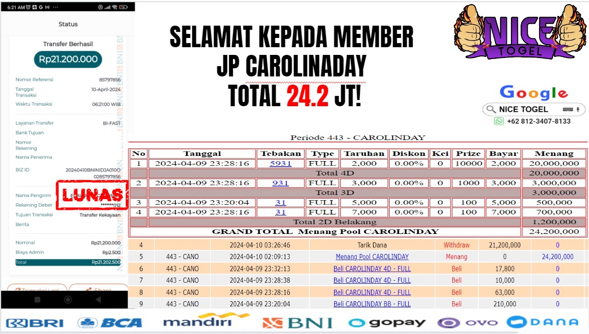 Selamat kepada User id : baa** Telah berhasil mendapatkan kemenangan besar pada permainan TOGEL CAROLINADAY Dengan kemenangan Sebesar Rp.24.200.000,- Setelah mengisi formulir withdraw dengan kurung waktu hanya 5 – 10 menit pihak NICETOGEL sudah melakukan transfer kepada pemilik Userid dan dana sudah dapat di cairkan oleh pemenang. Bukti pembayaran yang kami berikan merupakan bukti pembayaran yang SAH / VALID yang langung di dapatkan melaui tanda transfer transaksi dari Bank yang di tuju.