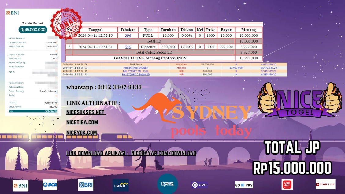 Selamat kepada User id : jm07** Telah berhasil mendapatkan kemenangan besar pada permainan TOGEL SYDNEY  Dengan kemenangan Sebesar Rp.15.000.000,- Setelah mengisi formulir withdraw dengan kurung waktu hanya 5 – 10 menit pihak NICETOGEL sudah melakukan transfer kepada pemilik Userid dan dana sudah dapat di cairkan oleh pemenang. Bukti pembayaran yang kami berikan merupakan bukti pembayaran yang SAH / VALID yang langung di dapatkan melaui tanda transfer transaksi dari Bank yang di tuju.