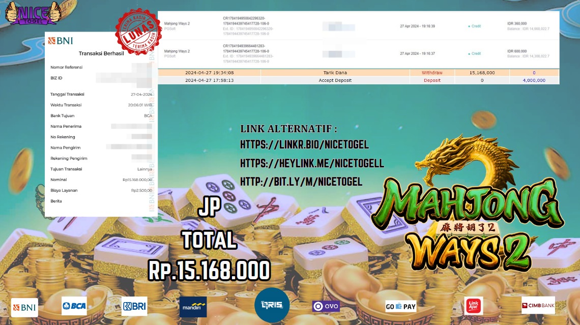 Selamat kepada User id : Anf** Telah berhasil mendapatkan kemenangan besar pada permainan SLOT MAHYONG WAYS 2 Dengan kemenangan Sebesar Rp.15.168.000,- Setelah mengisi formulir withdraw dengan kurung waktu hanya 5 – 10 menit pihak NICETOGEL sudah melakukan transfer kepada pemilik Userid dan dana sudah dapat di cairkan oleh pemenang. Bukti pembayaran yang kami berikan merupakan bukti pembayaran yang SAH / VALID yang langung di dapatkan melaui tanda transfer transaksi dari Bank yang di tuju.