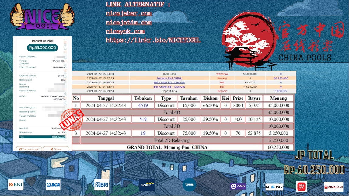 Selamat kepada User id : KOM** Telah berhasil mendapatkan kemenangan besar pada permainan TOGEL CHINA Dengan kemenangan Sebesar Rp.60.250.000,- Setelah mengisi formulir withdraw dengan kurung waktu hanya 5 – 10 menit pihak NICETOGEL sudah melakukan transfer kepada pemilik Userid dan dana sudah dapat di cairkan oleh pemenang. Bukti pembayaran yang kami berikan merupakan bukti pembayaran yang SAH / VALID yang langung di dapatkan melaui tanda transfer transaksi dari Bank yang di tuju.