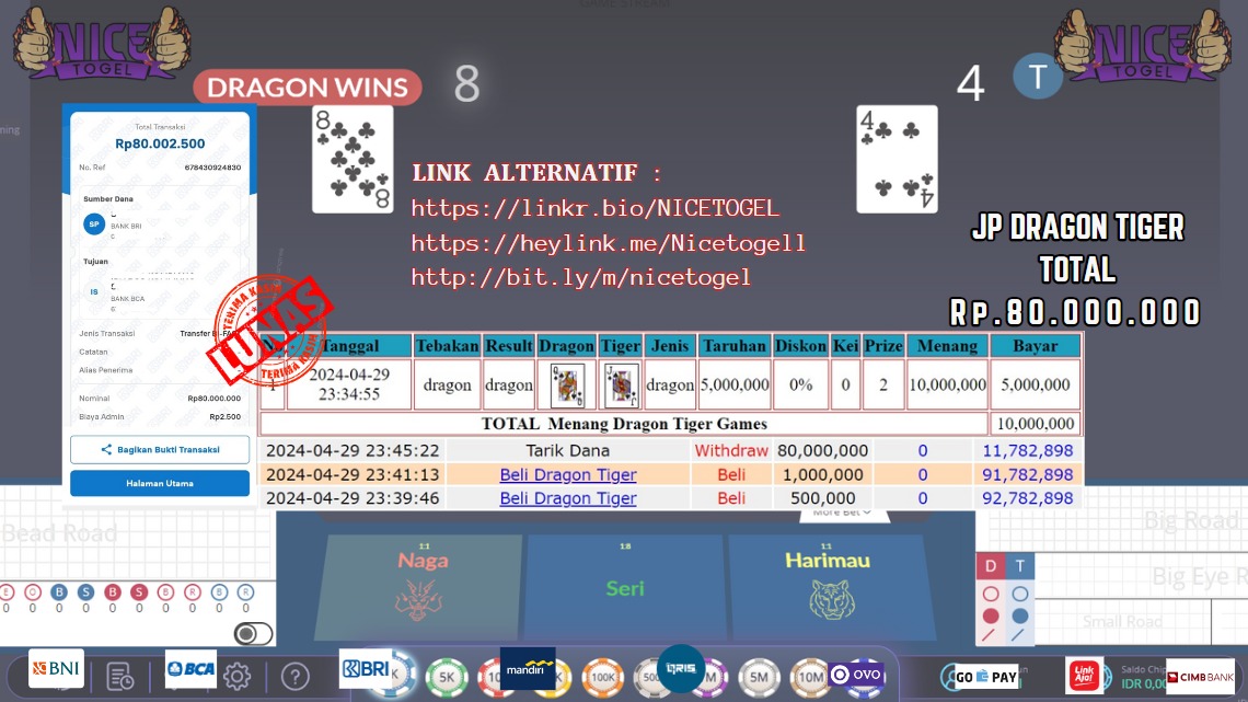Selamat kepada User id : Opi** Telah berhasil mendapatkan kemenangan besar pada permainan DRAGON TIGER GAMES Dengan kemenangan Sebesar Rp.80.000.000,- Setelah mengisi formulir withdraw dengan kurung waktu hanya 5 – 10 menit pihak NICETOGEL sudah melakukan transfer kepada pemilik Userid dan dana sudah dapat di cairkan oleh pemenang. Bukti pembayaran yang kami berikan merupakan bukti pembayaran yang SAH / VALID yang langung di dapatkan melaui tanda transfer transaksi dari Bank yang di tuju.